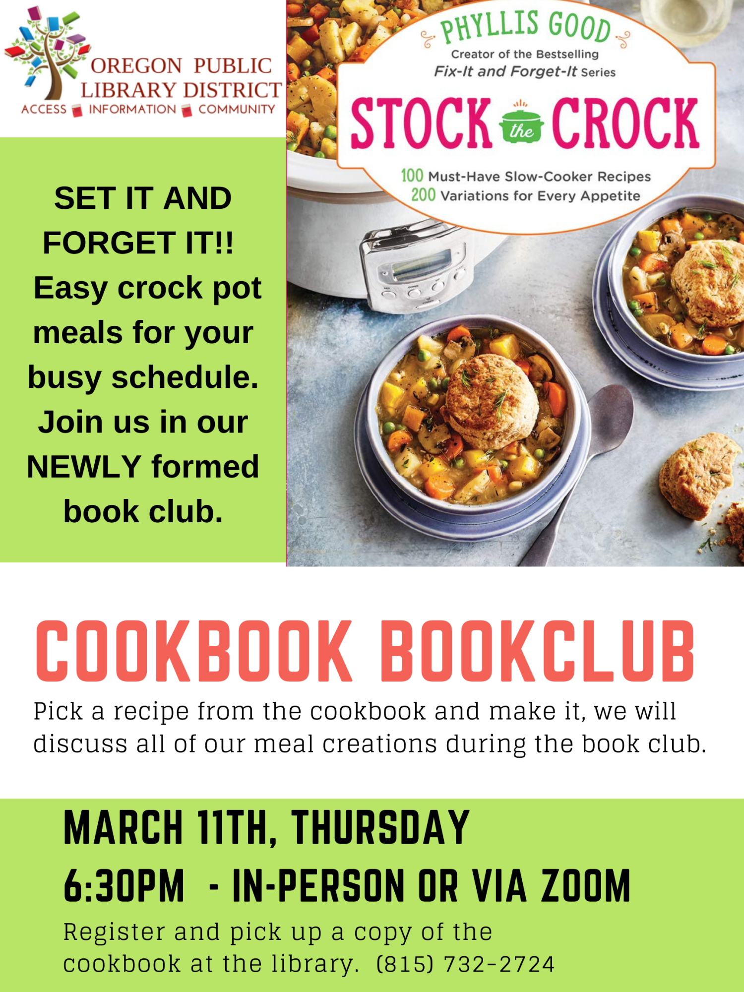Thursday, March 11th – 6:30pm COOKBOOK BOOK CLUB STOCK THE CROCK With things starting to role slowly back to pre-COVID, get some easy recipes for your crockpot. Join us in our NEWLY formed book club, trying various recipes from different cookbooks. For March, this group will meet in person and via Zoom. Pick up your copy of Stock the Crock Cookbook at the Library and pick one (or more) recipe to make and discuss during our discussion.