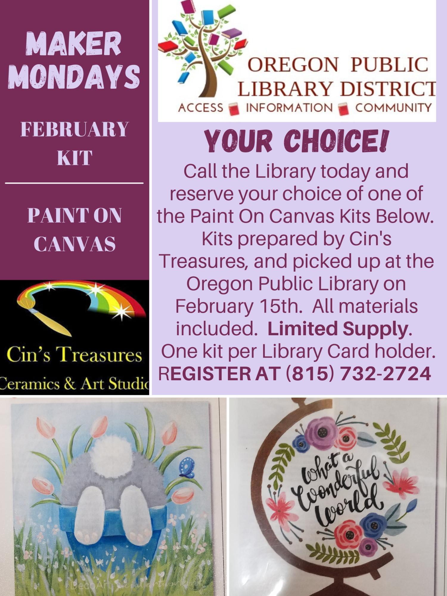 Take and Paint Kits from Cin’s Treasures Kits will be available for pick up beginning February 15th. Registration deadline Is January 11th. Choose between one of the two prints. Kit includes all materials to paint 1 image.