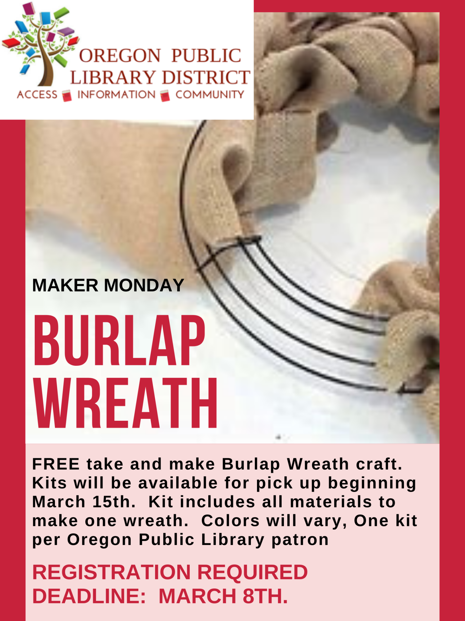 DIY BURLAP WREATH Deadline: March 8th Kits will be available for pick up beginning March 15th. Registration deadline Is March 8th. Kit includes all materials to make one wreath. Colors will vary. Registration required and only one kit per OPL patron.