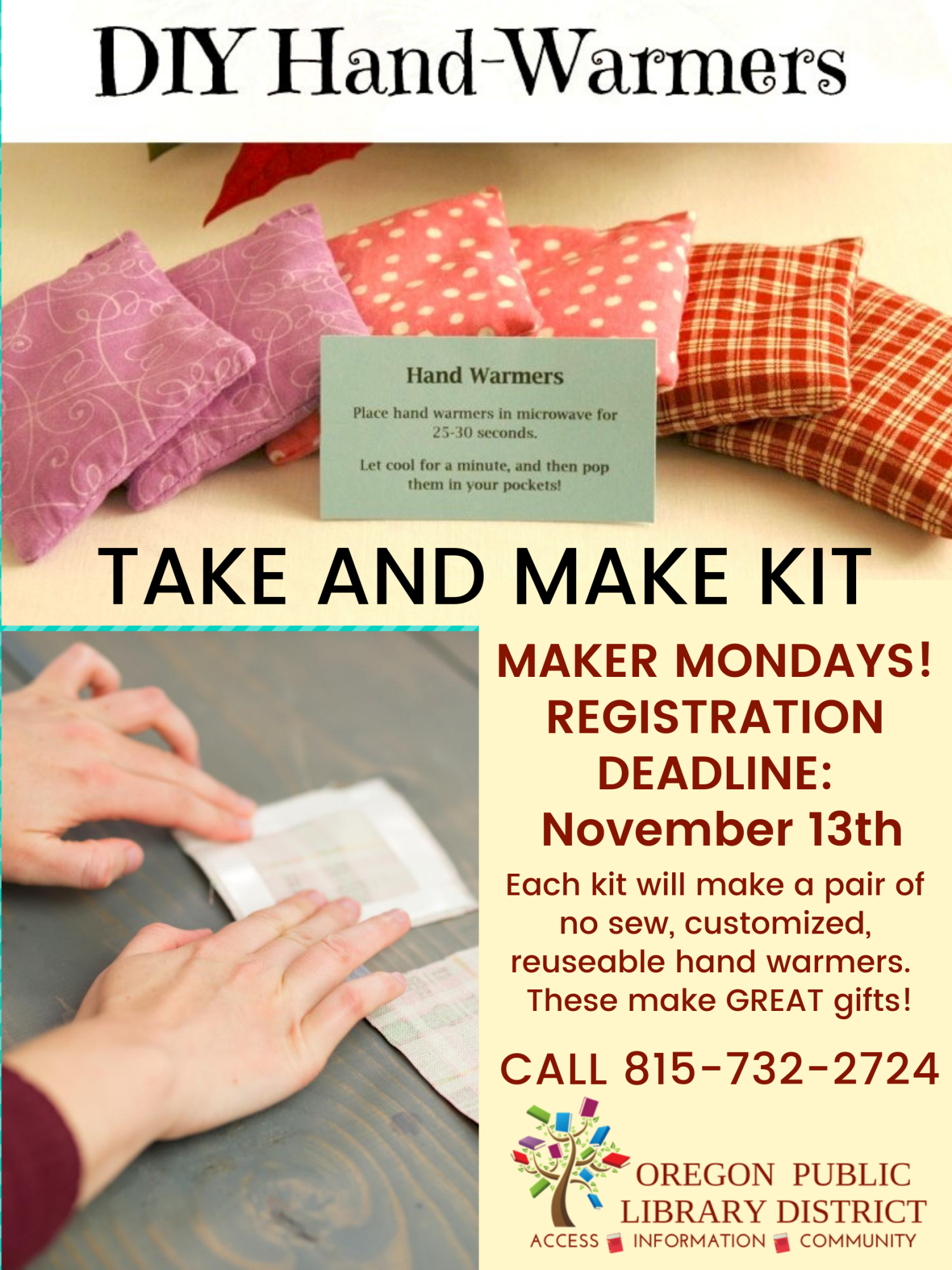 Ages 18 and up. The third Monday each month, the Library will provide a take and make craft kit. November will be a DIY hand warmers, the class will be held via ZOOM and will be recorded for use at any time. Please register by November 13th for your kit. Kits will be available beginning November 9th. Registration required (815) 732-2724.