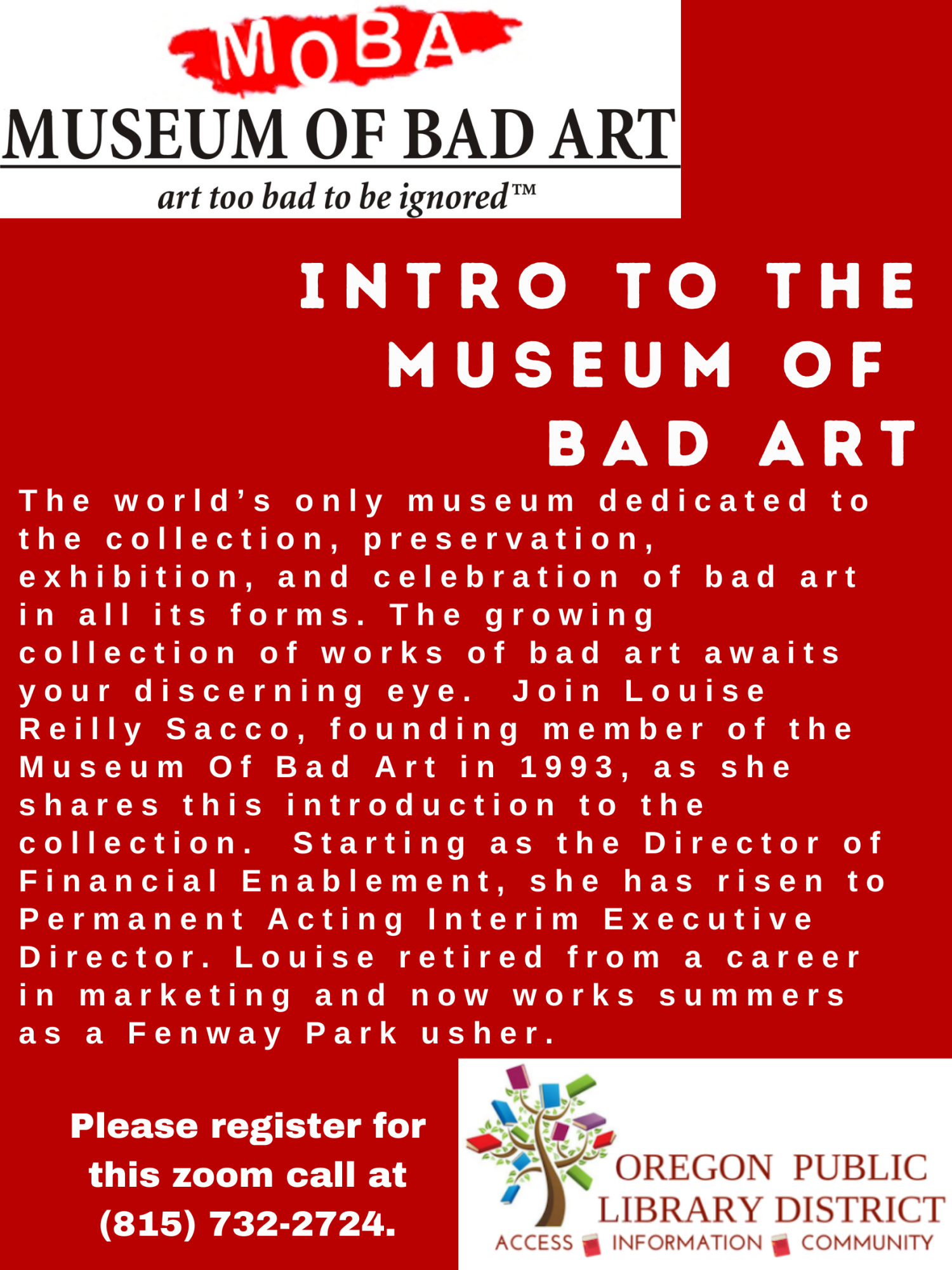 Virtual Program - The world’s only museum dedicated to the collection, preservation, exhibition, and celebration of bad art in all its forms. The growing collection of works of bad art awaits your discerning eye. Join Louise Reilly Sacco, founding member of the Museum Of Bad Art in 1993, as she shares this introduction to the collection. Starting as the Director of Financial Enablement, she has risen to Permanent Acting Interim Executive Director. Louise retired from a career in marketing and now works summers as a Fenway Park usher. Registration required (815) 732-2724