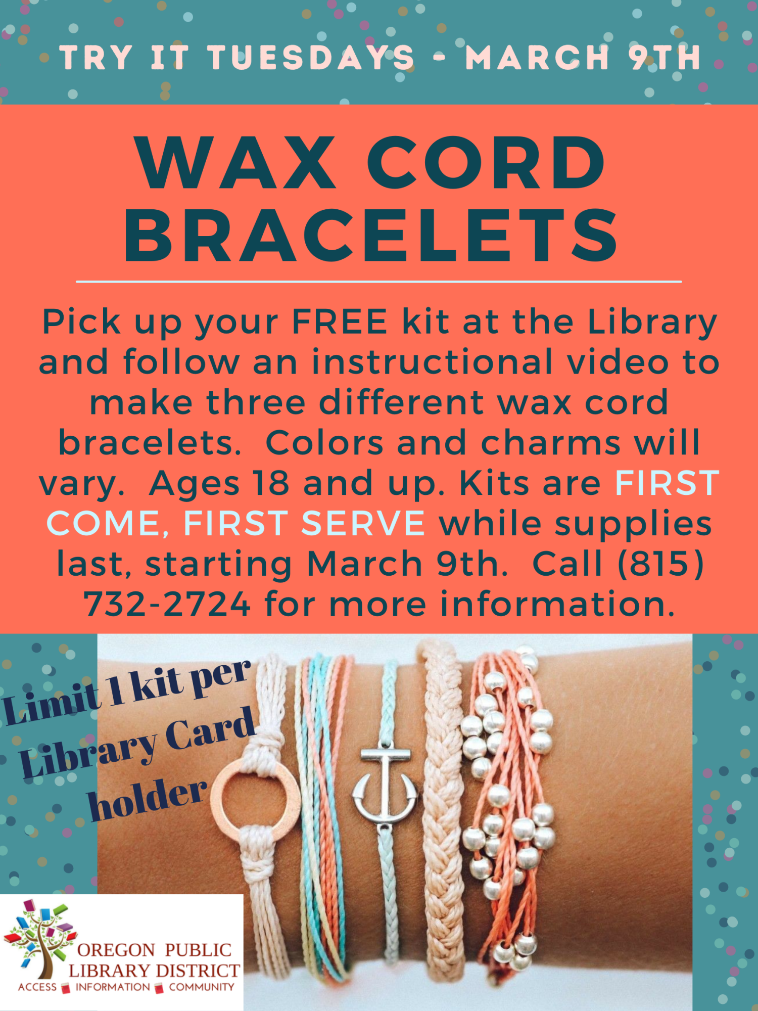 TRY IT TUESDAYS - DIY Bracelet Making Kits Available – March 9th Pick up your FREE kit and follow a YouTube video to make three different wax cord bracelets. Colors and charms will vary. Ages 18 and up. KITS ARE FIRST COME, FIRST SERVE for Oregon Library Card Holders