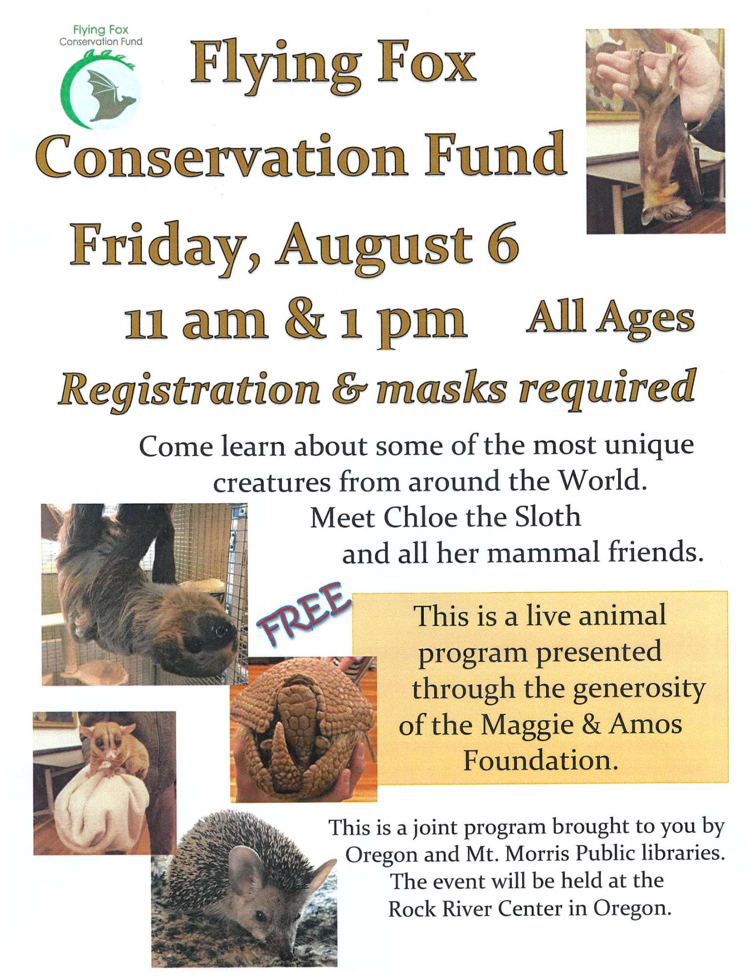 Come learn about some of the most unique creatures from around the World. Meet Chloe the Sloth and all her mammal friends. This is a live animal program presented through the generosity of the Maggie & Amos Foundation. This is a joint program brought to you by Oregon and Mt. Morris Public libraries. The event will be held at the Rock River Center in Oregon.