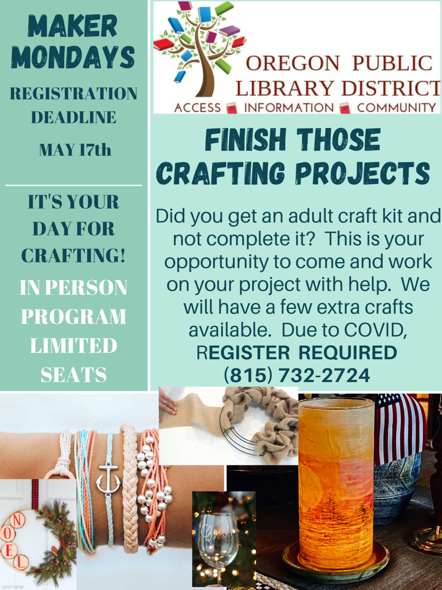 IT’S YOUR DAY FOR CRAFTING! May 17th at 6:00pm Deadline: May 14th Did you get an adult craft kit and not complete it? This is your opportunity to come and work on your project with help. We will have a few extra crafts available. Due to COVID registration required (815) 732-2724.