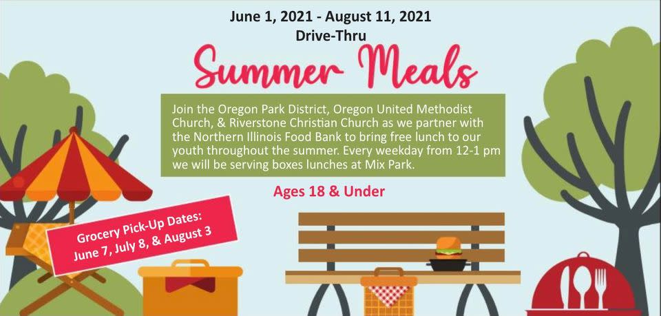 Join the Oregon Park District, Oregon United Methodist Church, & Riverstone Christian Church as we partner with the Northern Illinois Food Bank to bring free lunch to our youth throughout the summer. Every weekday from 12-1 pm we will be serving boxed lunches at Mix Park to ages 18 & under.