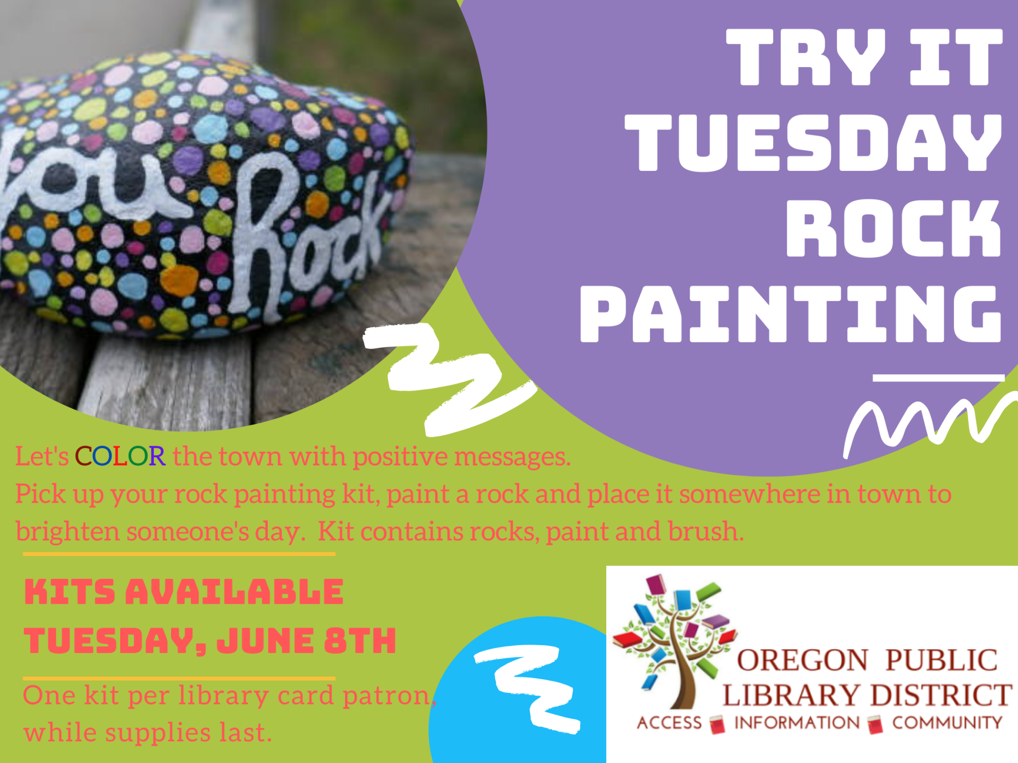 TRY IT TUESDAY – Tuesday, June 8th (while supplies last) SPREAD POSITIVITY THROUGH ROCK PAINTING Let’s “color” the town with messages of “patience, peace, kindness, hope, etc”. Pick up your rock painting kit, paint a rock and place it somewhere in town to make someone’s day. Kits contain rocks, paints and brush. One (1) kit per library patron and while supplies last.